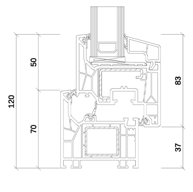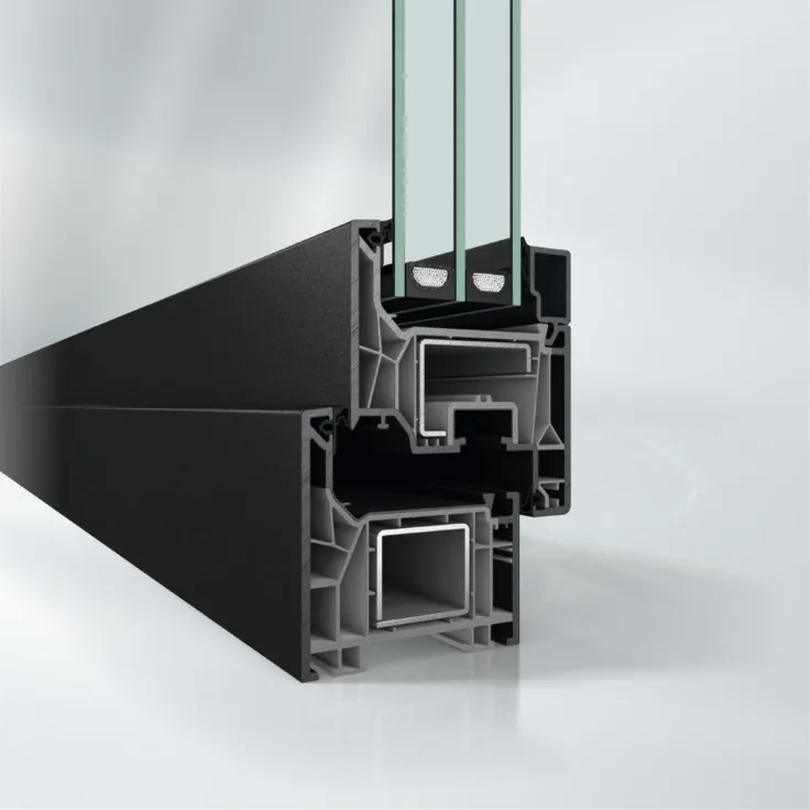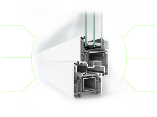 La struttura a 5/6 camere garantisce ottimi valori di isolamento, con possibilità di vetrocamera tripla fino a 54 mm e valori Uw inferiori a 0,80 W/(m²K).